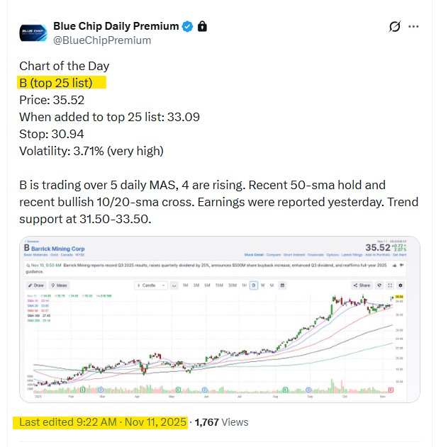 - On 11/21/25, we posted (B) as our Chart of the Day best idea for subscribers, at 35.52.
