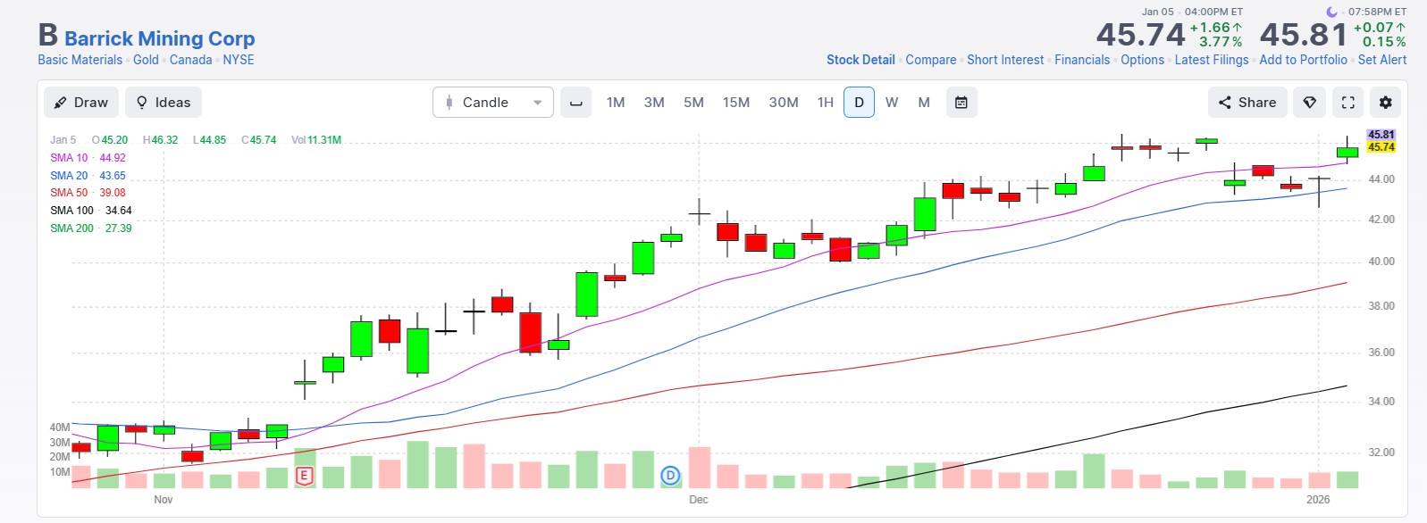 - B closed 1/5/26 at 45.74, +28.77%.