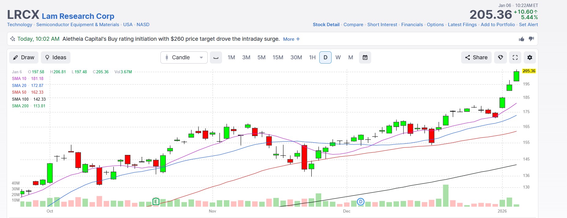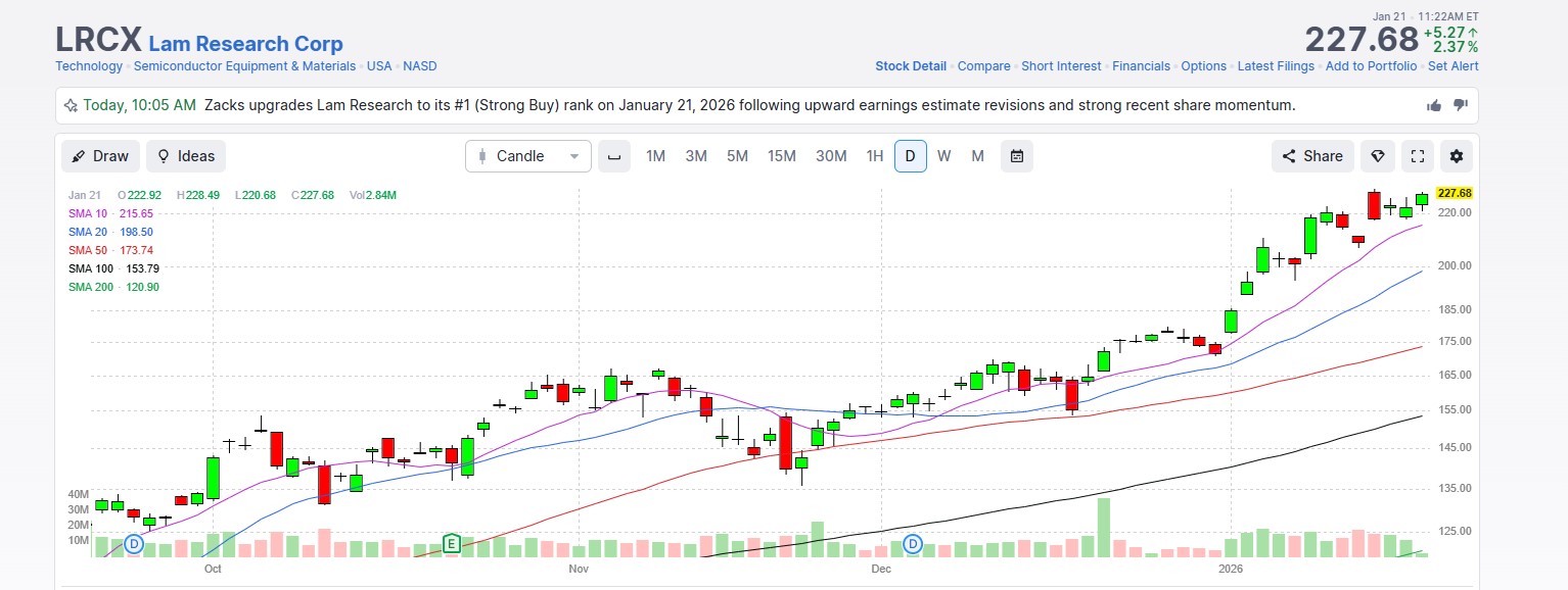 - LRCX is trading at 205.36 just three trading days later (below), +16.26%.