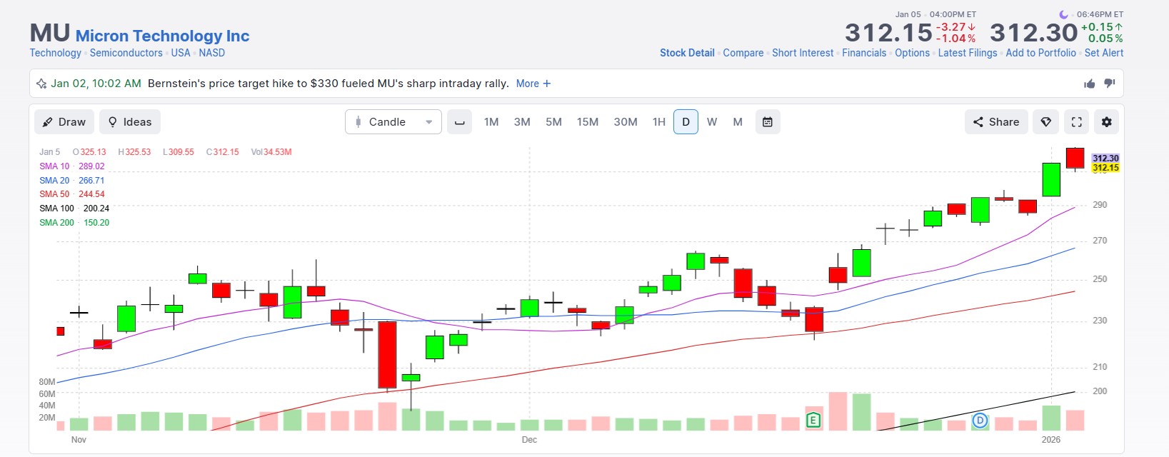 - MU closed 1/5/26 at 312.15, +32.59%.